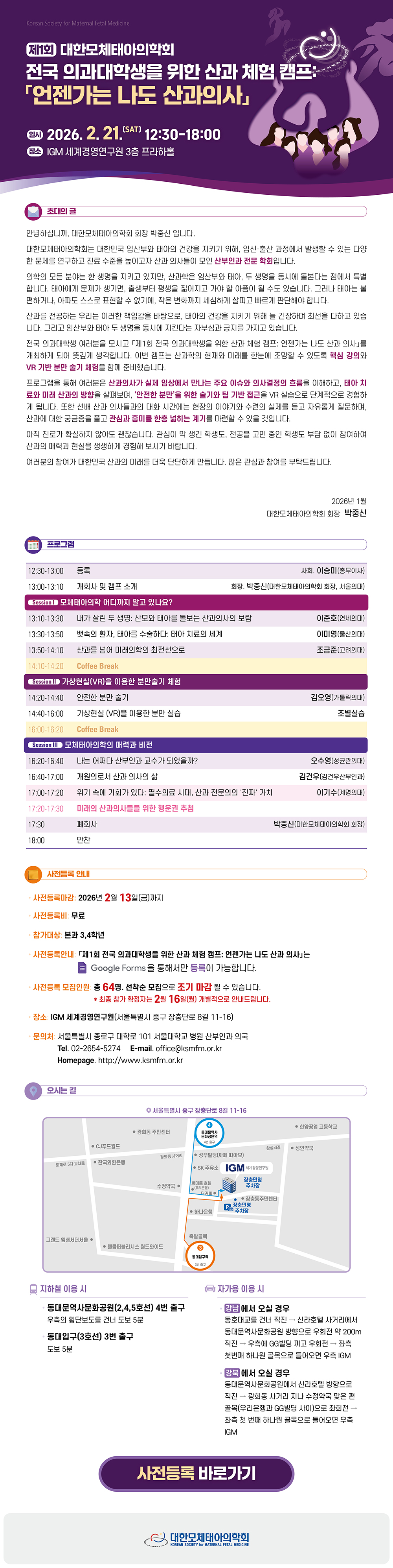 가. 행 사 명 : 제1회 전국 의과대학생을 위한 산과 체험 캠프 나. 일 시 : 2026년 2월 21일(토) 12:30 ~ 17:30 다. 장 소 : IGM 세계경영연구원 (서울시 중구) 라. 참가대상 : 본과 3,4학년 마. 등 록 비 : 무료