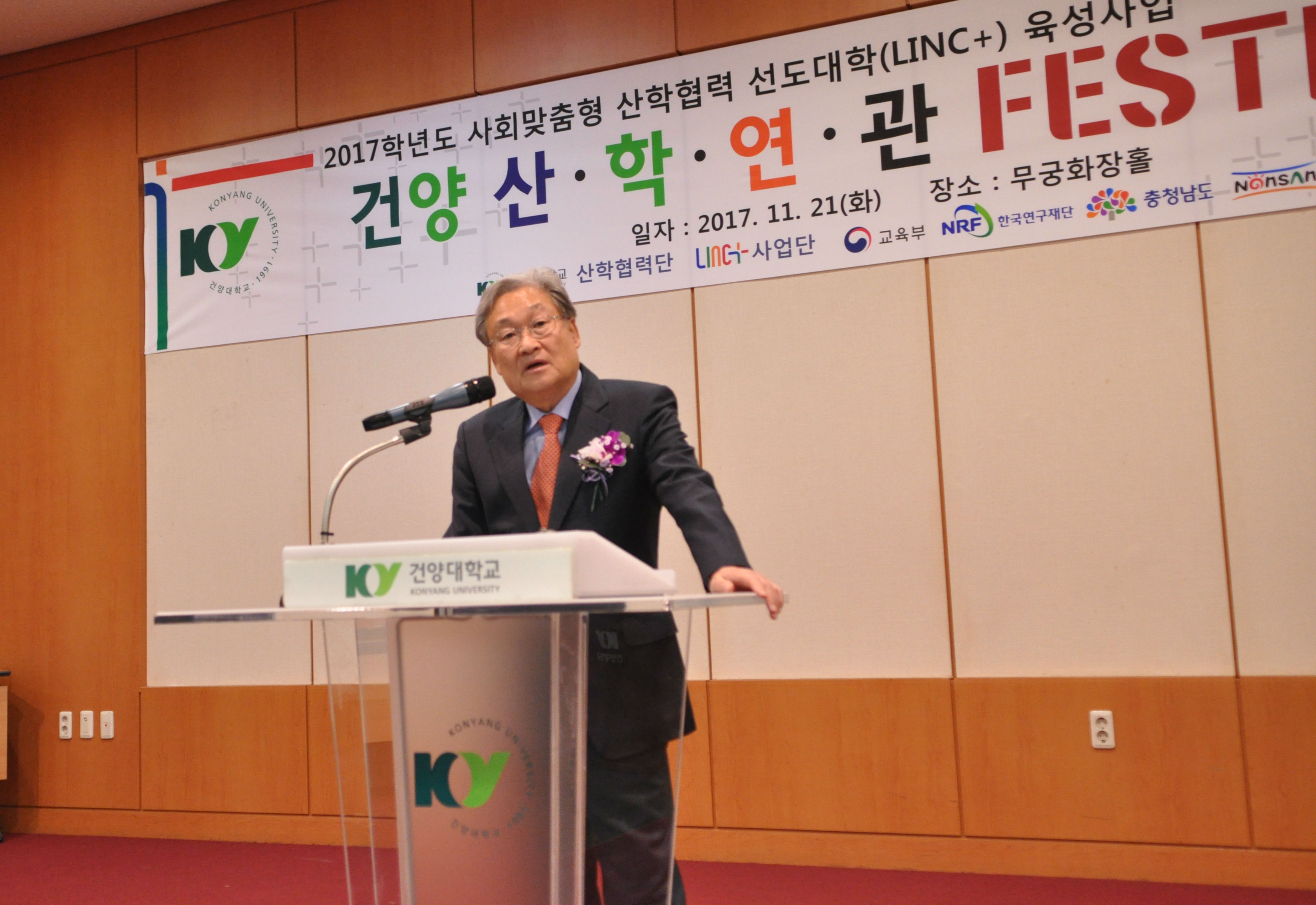 <사진설명> 사진 1. 22일 건양대 논산 창의융합캠퍼스 명곡정보관에서 열린 2017 건양 산·학·연·관 페스티벌에서 김영일 건양대 산학협력단장 겸 링크플러스 사업단장이 사업 경과보고를 하는 모습