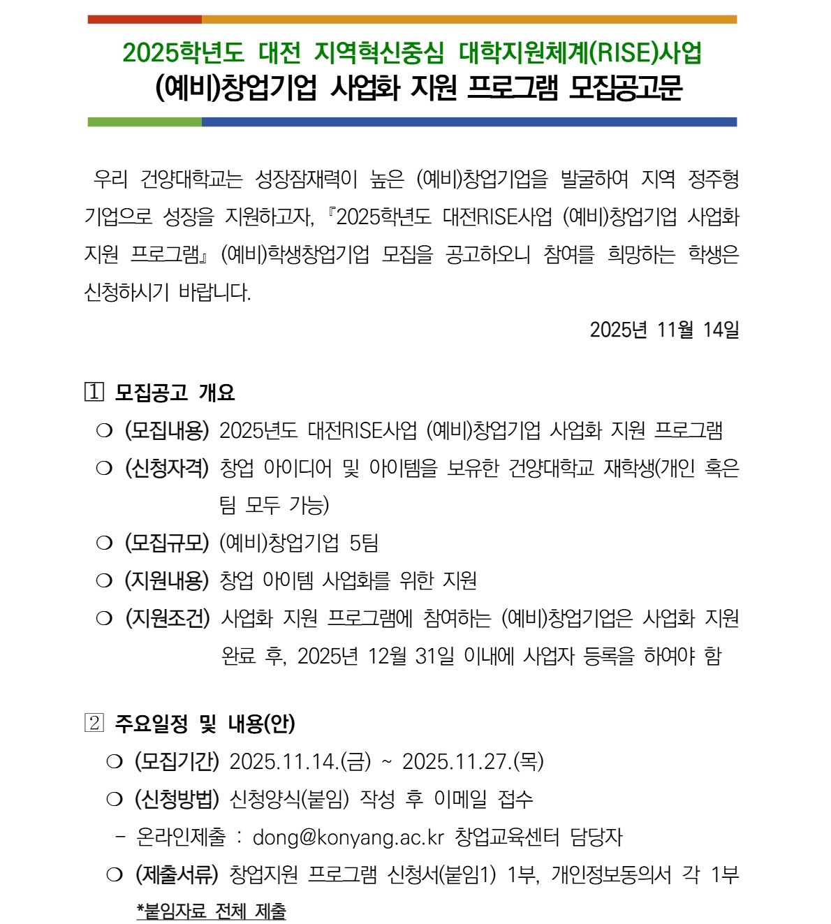 | 제목 | 2025학년도 대전RISE 창업 사업화지원 프로그램 모집 공고 | ||||