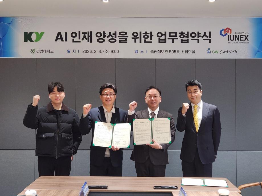 건양대학교(총장 김용하) SW중심대학사업단(사업단장 김용석)은 2월 4일 ㈜아이언닉스와 의료 AI 및 소프트웨어 분야 전문 인재 양성, AI 전환(AX) 생태계 조성을 위한 전략적 산학협력을 체결했다. 이번 협약을 기반으로 양 기관은 의료 AI 기술을 활용한 공동 연구 개발, 산학 공동 교육과정 운영, 학생 현장실습 및 취업 연계를 추진할 예정이다.