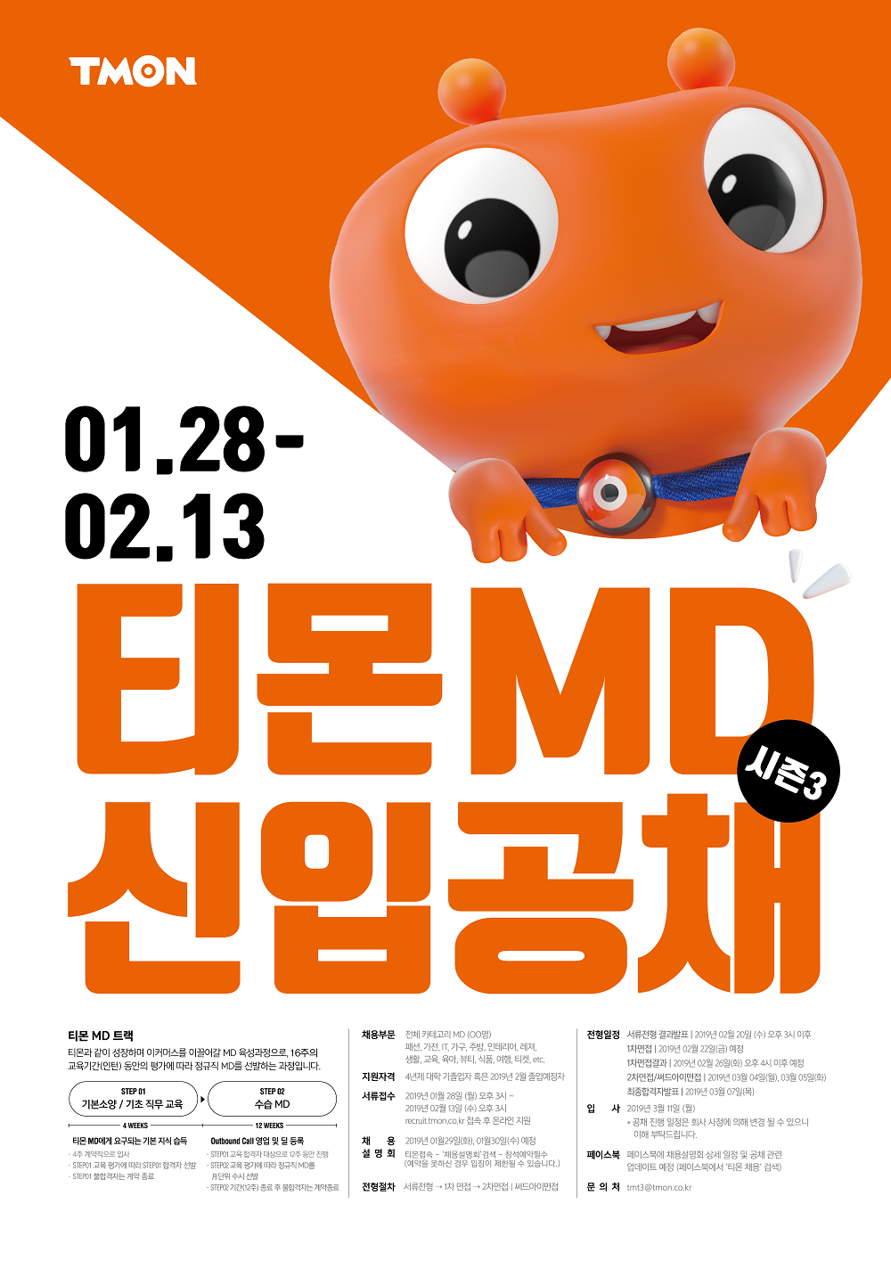 『 티몬 MD 신입공채 안내 』글의 상세내용을 확인하는 표로 제목, 부서명, 등록일, 조회, 첨부, 내용으로 나뉘어 설명합니다.