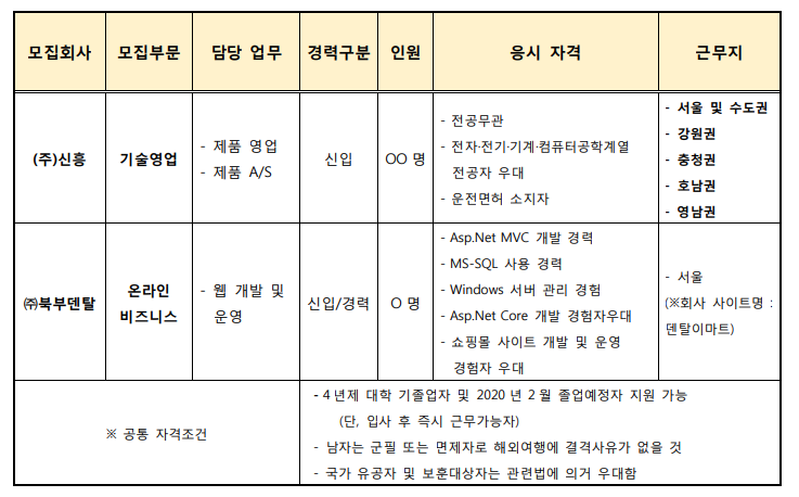 1. 제출서류 및 접수처 - 접수기간 : 2019년 10월 21일(월) ~ 2019년 10월 28일(월) - 제출서류 : 당사 홈페이지 입사지원서 양식 - 접수방법 : 온라인 접수( http://www.shinhung.co.kr ) 당사 홈페이지 인재채용 → 온라인지원 → 지원서 작성 2. 전형방법 - 서류전형 → 필기시험 → 부서장 및 임원 면접 → 최종면접 → 채용검진 → 공통입문교육 (신흥양지연수원) - 필기시험 과목 : 일반상식,논술 3. 기타 - 각 단계별 전형 결과는 당사 홈페이지( http://www.shinhung.co.kr ) 채용정보에서 확인하실 수 있습니다. - 지원부문 및 근무지는 지원자의 선택을 최우선 고려하여 배치하나, 업무적합도 및 채용규모에 따라서 다른 부문으로 채용이 진행될 수 있습니다. - 채용 합격 및 입사 후에도 입사지원서 또는 제출서류 내용이 거짓으로 확인될 경우 합격 및 입 사를 취소할 수 있습니다. 4. 문의처 - 본사(서울) 경영지원실 박진영 대리 Tel. 02-6366-2271 E-mail. jypark@shinhung.co.kr |