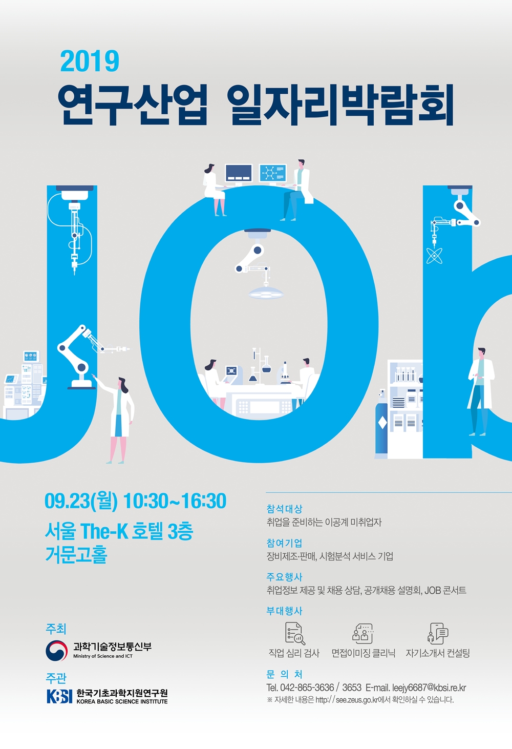 1. 행 사 명 : 2019년 연구산업 일자리박람회 2. 행사일시 : 2019.9.23.(월), 10:30~16:30 3. 행사장소 : 서울 The-K호텔 3층 거문고홀 4. 주최/주관 : 과학기술정보통신부 / 한국기초과학지원연구원 5. 참가대상 : 이공계대학 졸업예정자 및 졸업자 6. 링크 사이트 : http://see.zeus.go.kr/notice/form.do?seq=211&menuId=MNU_0000000000000270