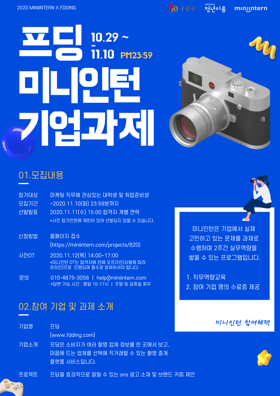 ▷ 모집 기간 모집 기간 : ~ 11/10.(화) 23:59까지 ▷ 추천 참여 대상 -마케팅직무에 흥미가 있고 경험을 쌓아보고 싶은 구직자 -자신만의 아이디어를 제안해보고 싶은 참가자 -SNS 및 트랜드를 빨리 읽는 예비 마케터 ▷ 활동 지역 사전OT (오프라인) 일정: 11/12.(목) 14:00 ~ 17:00 장소 : 구로 청년이룸 / 서울시 구로구 오리로 1130 지하 1층 (상황에 따라 온라인으로 진행할 수 있음) *본 채용형 미니인턴 참가시 미니인턴 이력서/자기소개서 등록 및 사전OT 참가는 필수 사항입니다. *선발된 인원만 과제 수행이 가능하며 사전OT 이후 일정은 온라인으로 2주간 개별 진행됩니다. ▷ 지원하는 방법 신청 방법 : https://miniintern.com/projects/820
