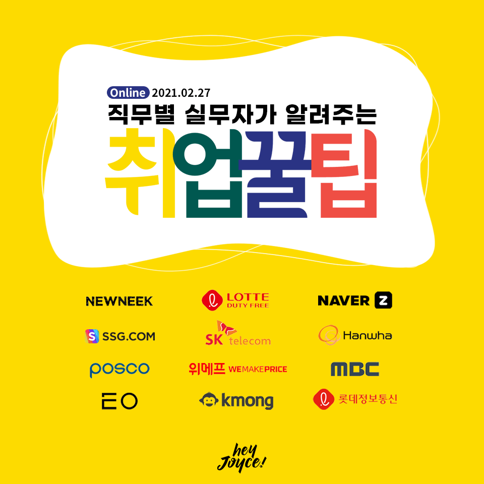 [직무별 실무자가 알려주는 취업 꿀팁] - 일정: 2021년 02월 27일 (토) 1:00 pm - 5:55 pm - 타겟: 여성 취업준비생 - 참여 회사: SK텔레콤, 롯데면세점, Naver Z, SSG, MBC, 한화생명, 포스코, 위메프, 뉴닉, EO, 헤이조이스, 크몽, 롯데정보통신 등 - 진행 방식: zoom 웨비나를 이용한 온라인 진행 ※ 해당 이벤트는 여성만 참여 가능합니다. 자세한 내용은 홈페이지(https://heyjoyce.com)확인하시기 바랍니다. 감사합니다.