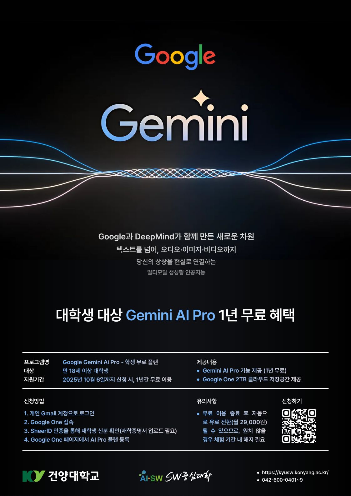 『 SW중심대학사업 Gemini 무료혜택 』글의 상세내용을 확인하는 표로 제목, 부서명, 등록일, 조회, 첨부, 내용으로 나뉘어 설명합니다.